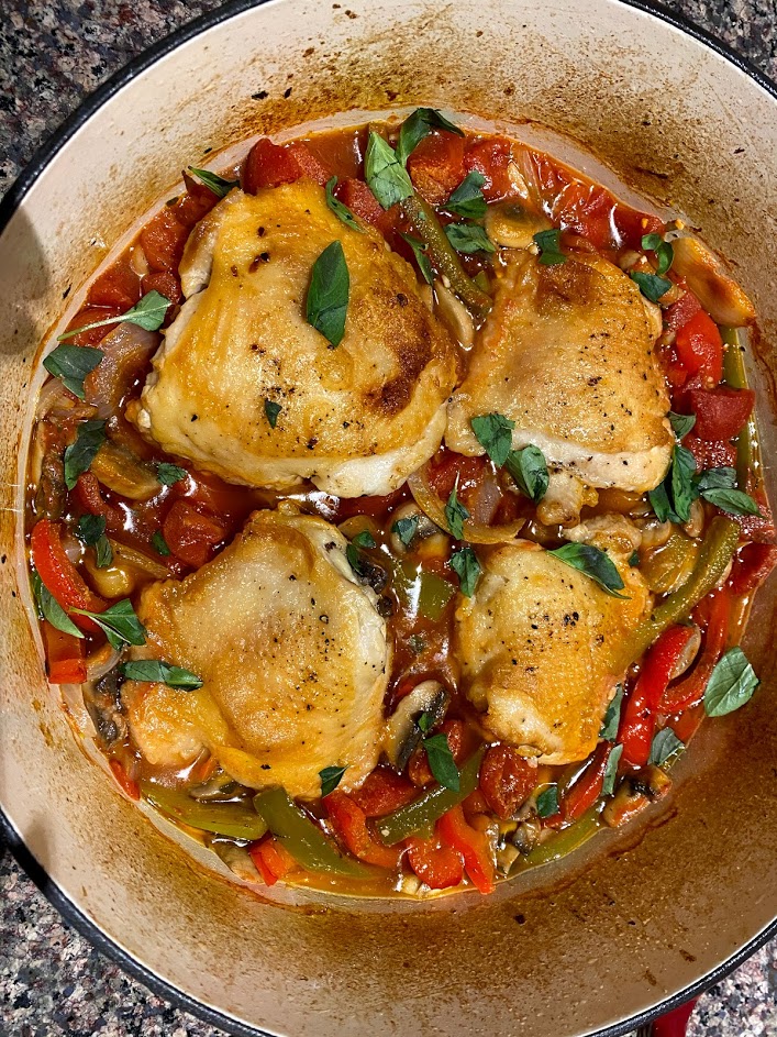 - Pour in the tomatoes and stir to combine. Return the chicken to the Dutch Over by layering chicken, skin-side up, over vegetable mixture, without submerging it. Cover and reduce heat on stovetop to low. Cook for 45-50 minutes.